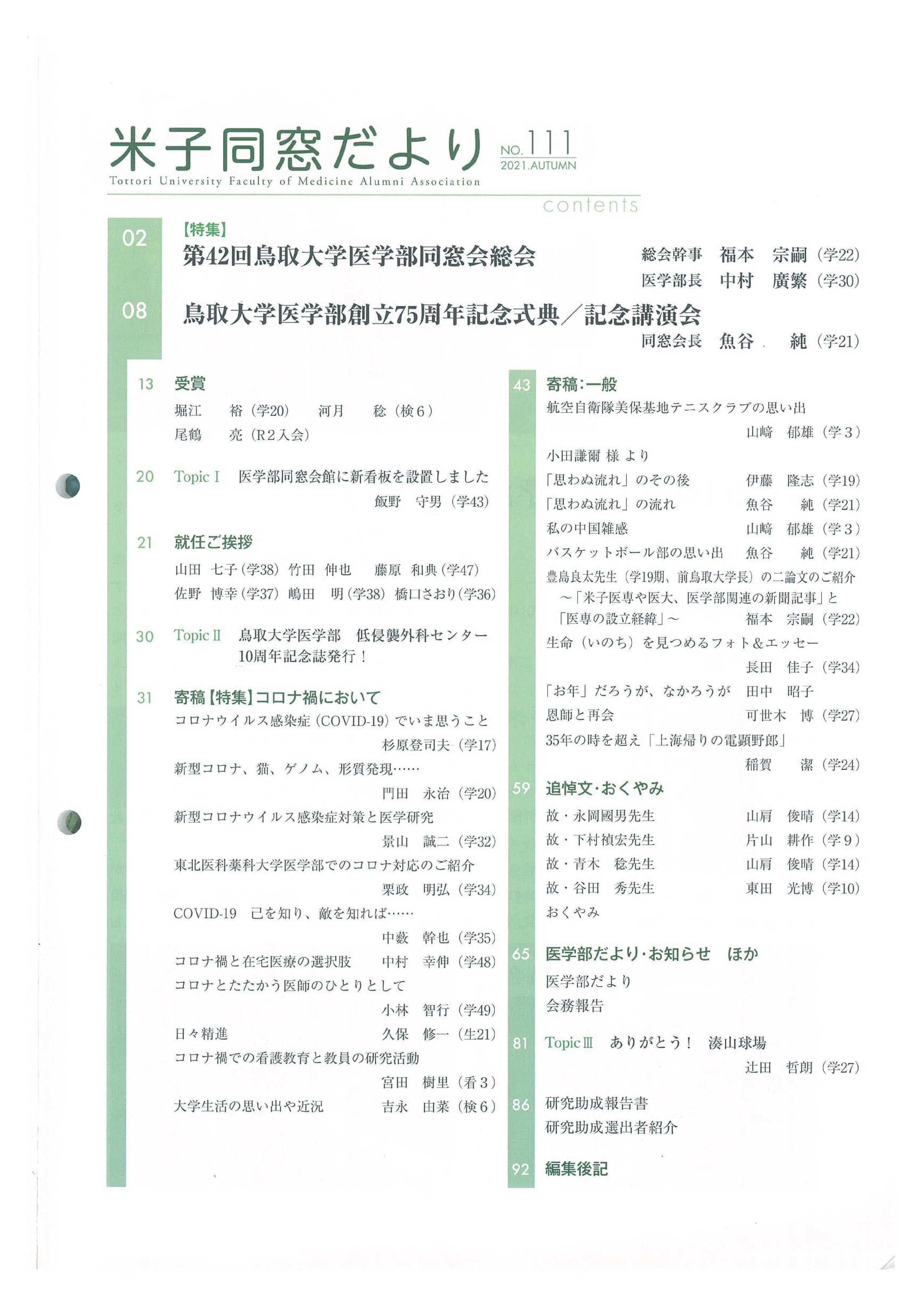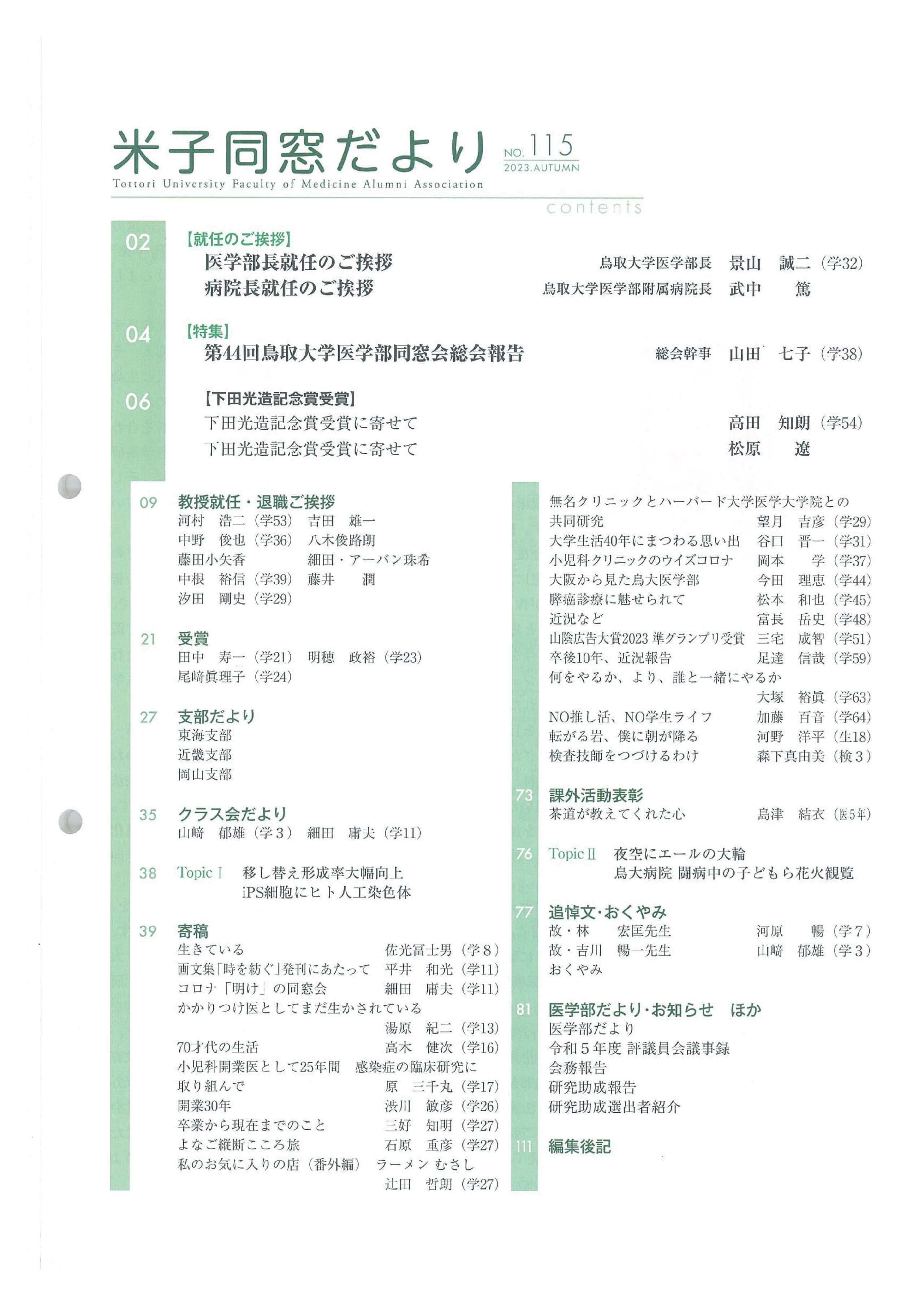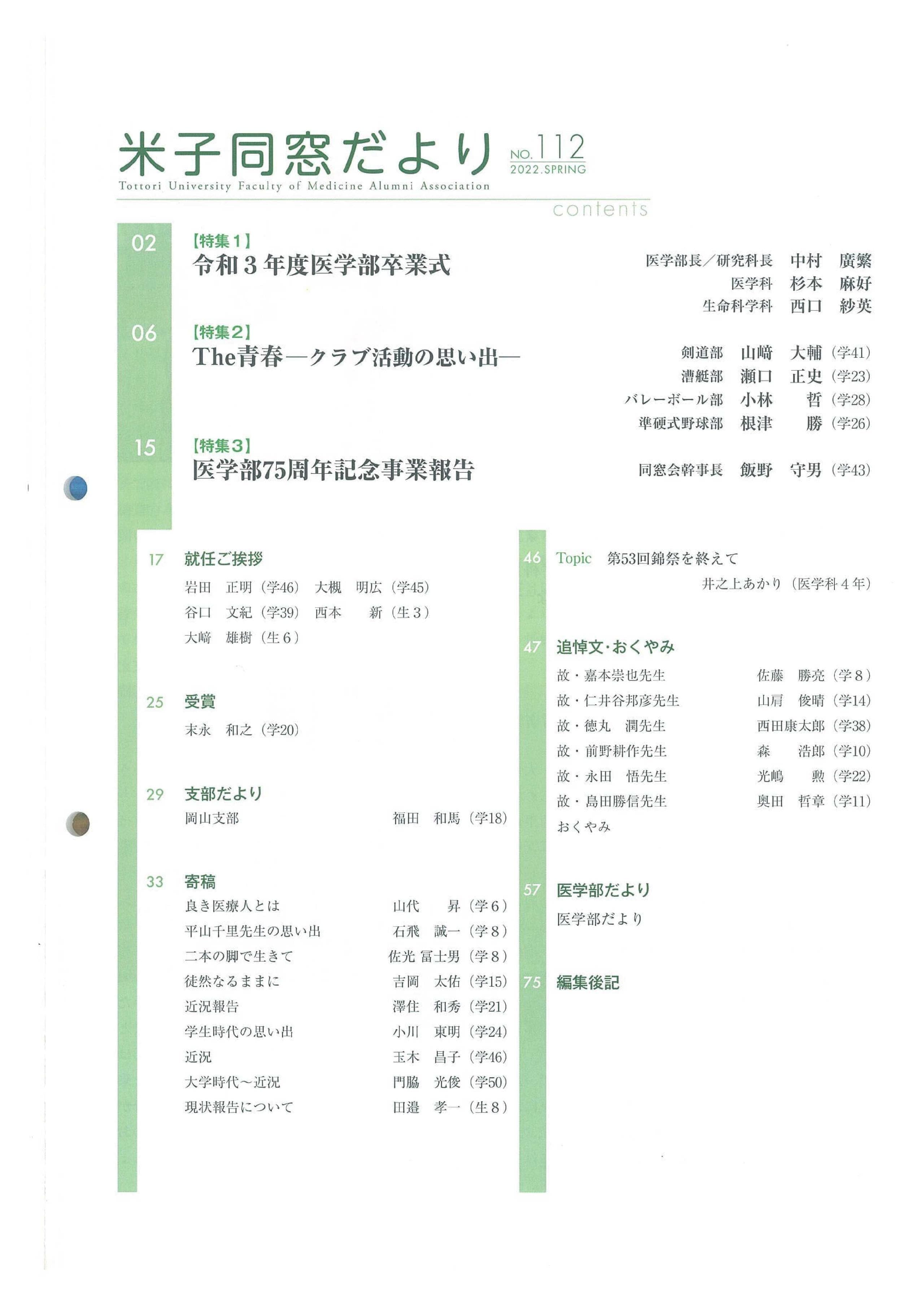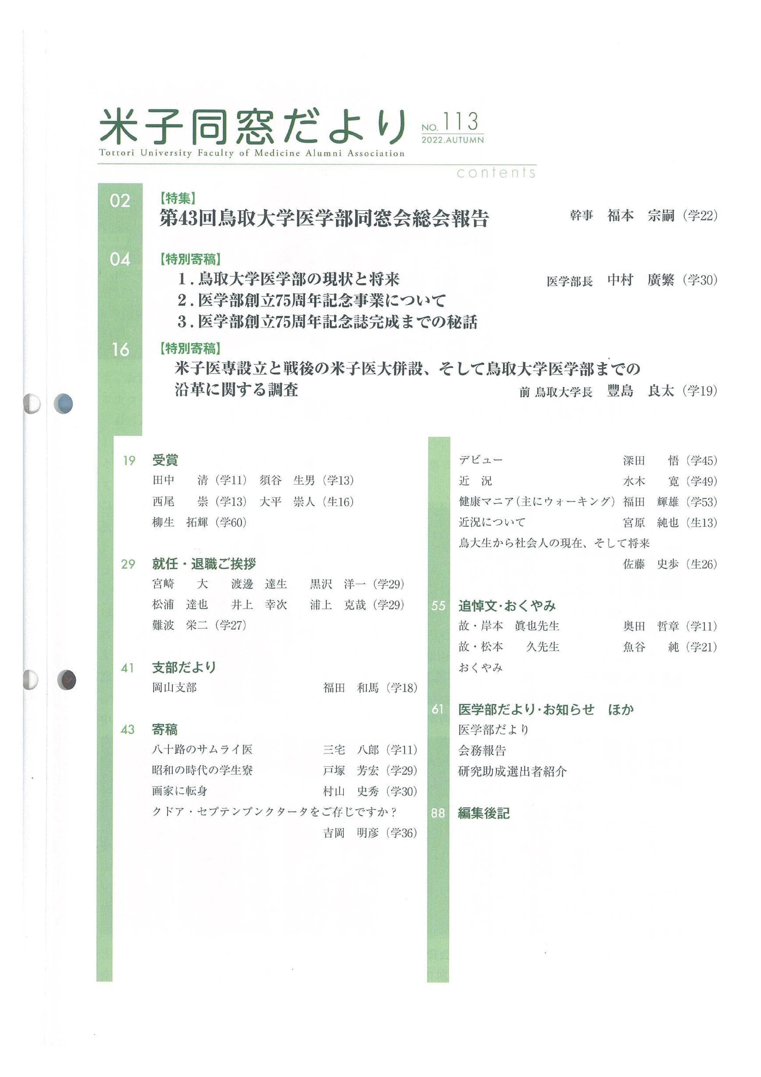 米子同窓だより 全文は、会員専用ページにて閲覧可能です。 会員専用 2025年 No.118 SPRING No.118 SPRING目次 No.119 AUTUMN No.119 AUTUMN目次 2024年 No.116 SPRING No.116 SPRING目次 No.117 AUTUMN No.117 AUTUMN目次 2023年 No.114 SPRING No.114 SPRING目次 No.115 AUTUMN No.115 AUTUMUN目次 2022年 No.112 SPRING No.112 SPRING目次 No.113 AUTUMN No.113 AUTUMUN目次 2021年 No.110 SPRING No.110 SPRING目次 No.111 AUTUMN No.111 AUTUMUN目次 2020年 No.108 SPRING No.108 SPRING目次 No.109 AUTUMN No.109 AUTUMUN目次 2019年 No.107 AUTUMN No.107 AUTUMUN目次 お知らせ 会長挨拶 同窓会概要 会則 研究助成 会館利用案内 米子同窓だより 個人情報保護方針 異動連絡 同窓会費の納入 お問い合わせ