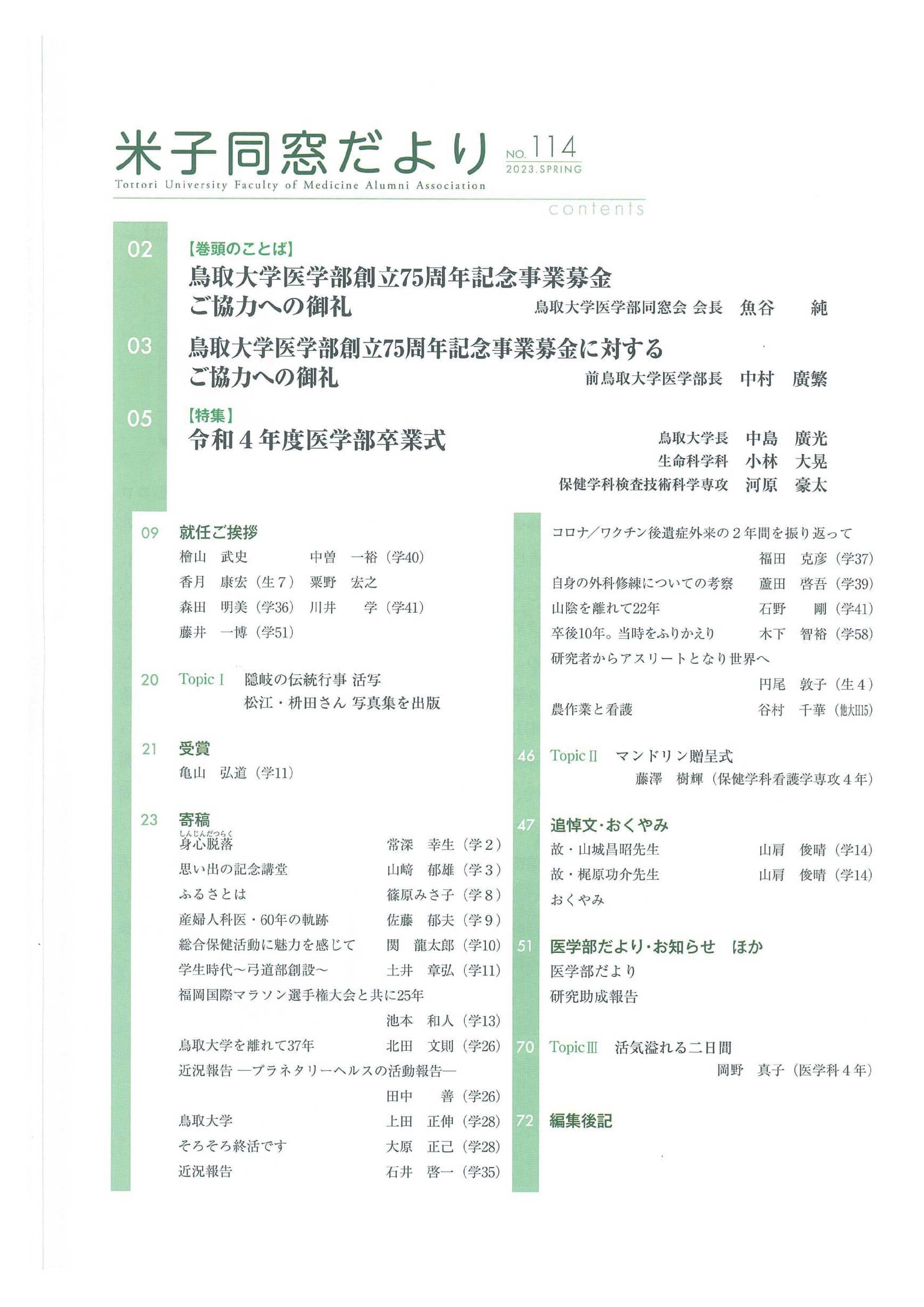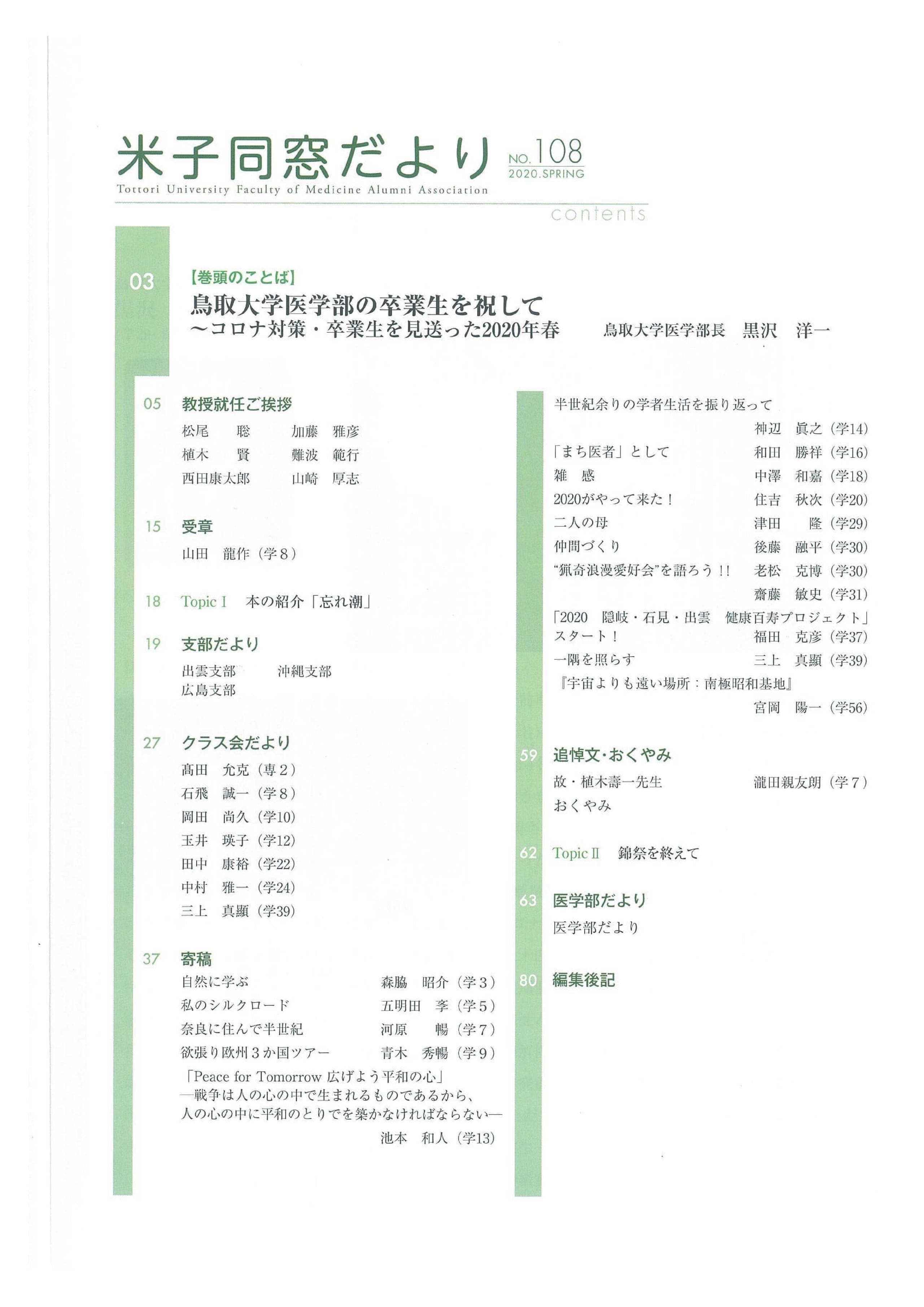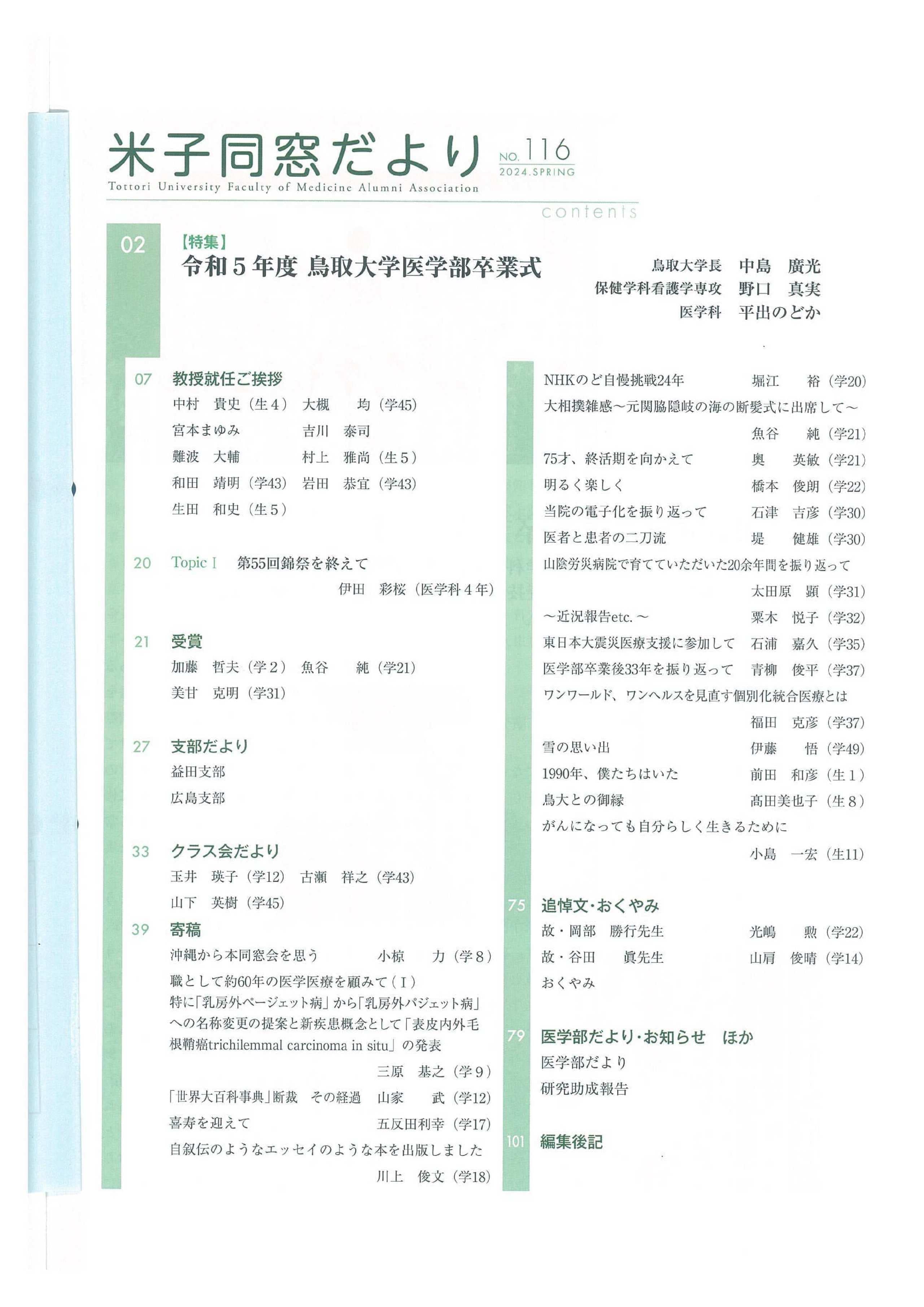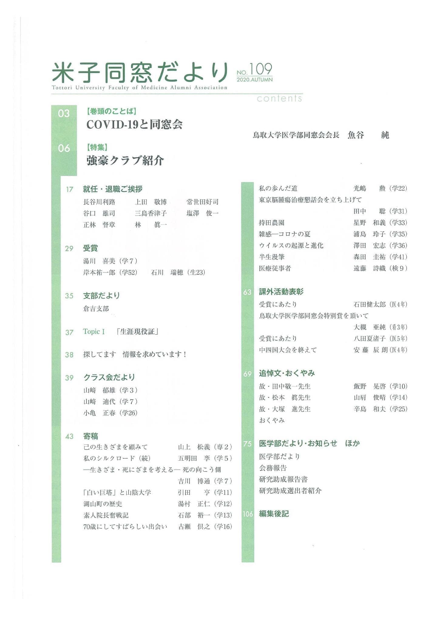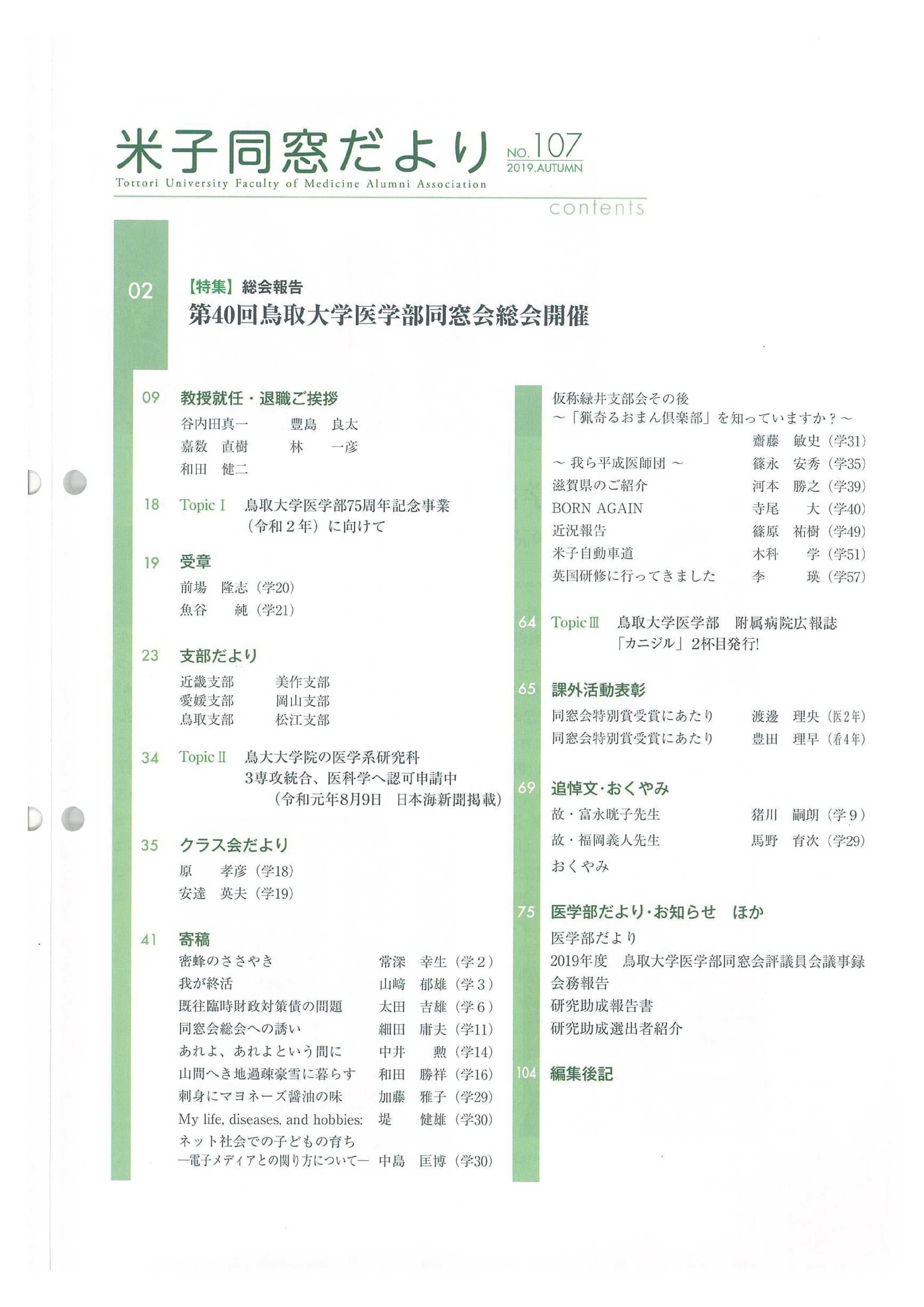 米子同窓だより 全文は、会員専用ページにて閲覧可能です。 会員専用 2025年 No.118 SPRING No.118 SPRING目次 No.119 AUTUMN No.119 AUTUMN目次 2024年 No.116 SPRING No.116 SPRING目次 No.117 AUTUMN No.117 AUTUMN目次 2023年 No.114 SPRING No.114 SPRING目次 No.115 AUTUMN No.115 AUTUMUN目次 2022年 No.112 SPRING No.112 SPRING目次 No.113 AUTUMN No.113 AUTUMUN目次 2021年 No.110 SPRING No.110 SPRING目次 No.111 AUTUMN No.111 AUTUMUN目次 2020年 No.108 SPRING No.108 SPRING目次 No.109 AUTUMN No.109 AUTUMUN目次 2019年 No.107 AUTUMN No.107 AUTUMUN目次 お知らせ 会長挨拶 同窓会概要 会則 研究助成 会館利用案内 米子同窓だより 個人情報保護方針 異動連絡 同窓会費の納入 お問い合わせ