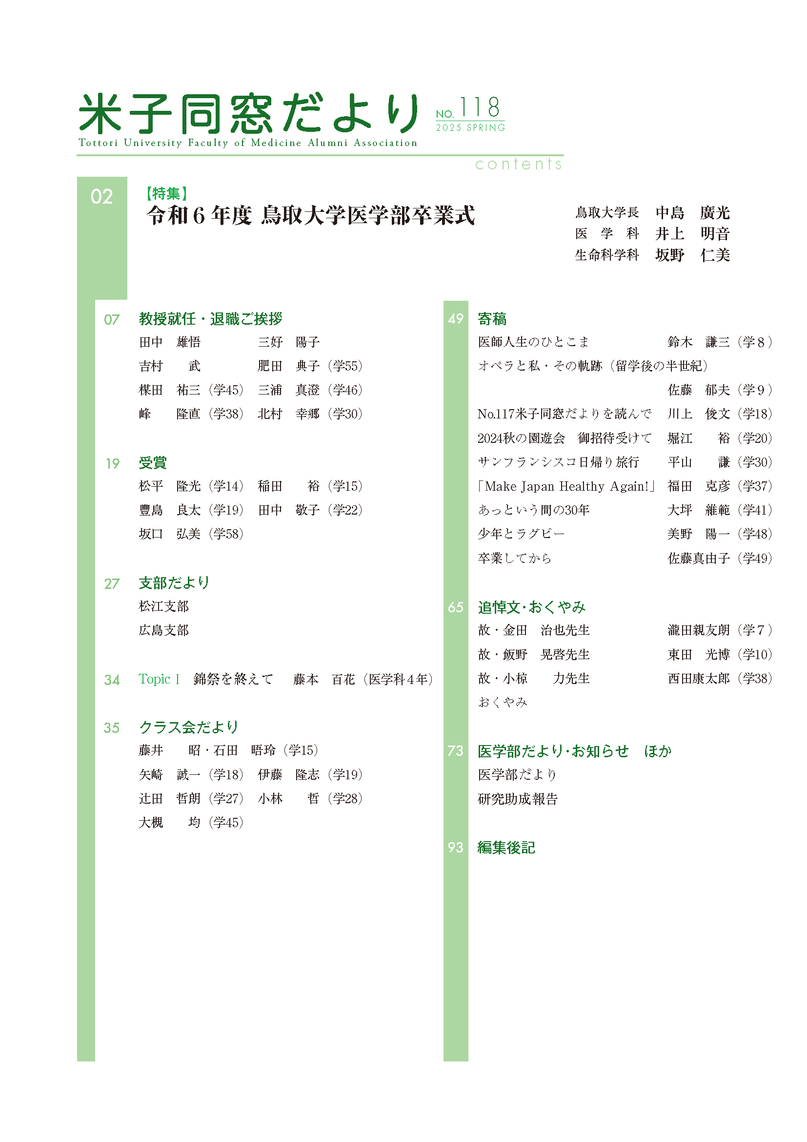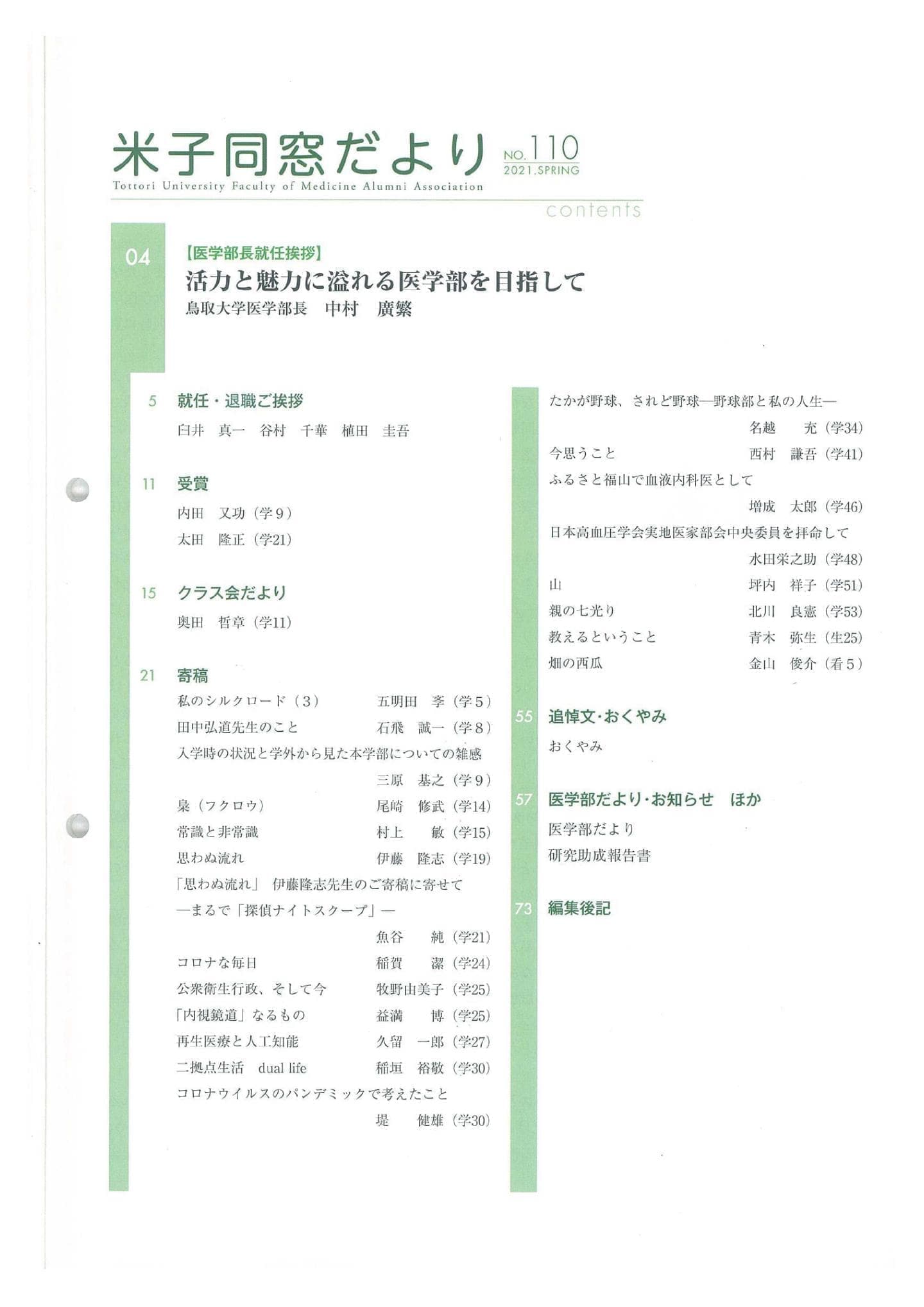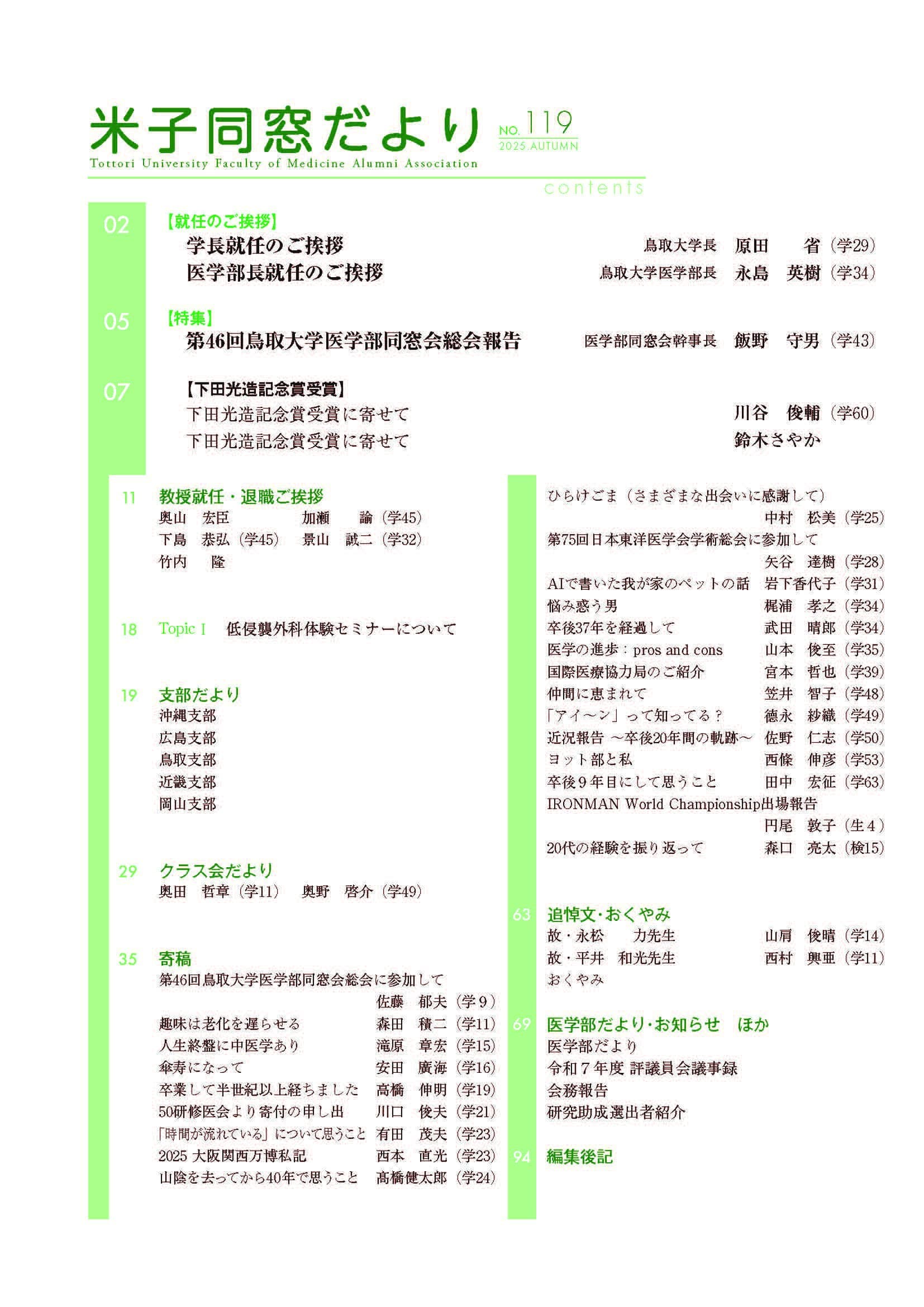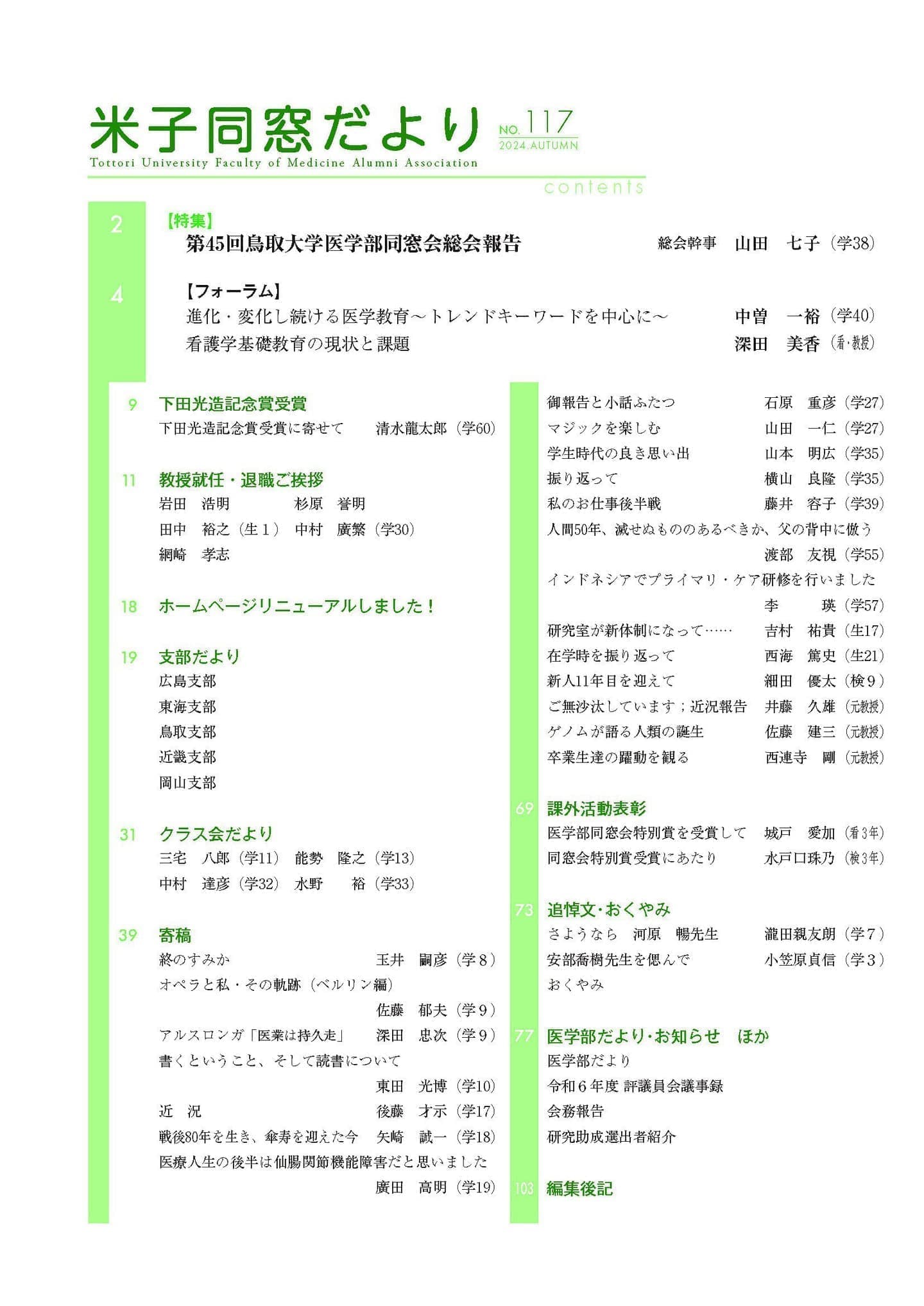 米子同窓だより 全文は、会員専用ページにて閲覧可能です。 会員専用 2025年 No.118 SPRING No.118 SPRING目次 No.119 AUTUMN No.119 AUTUMN目次 2024年 No.116 SPRING No.116 SPRING目次 No.117 AUTUMN No.117 AUTUMN目次 2023年 No.114 SPRING No.114 SPRING目次 No.115 AUTUMN No.115 AUTUMUN目次 2022年 No.112 SPRING No.112 SPRING目次 No.113 AUTUMN No.113 AUTUMUN目次 2021年 No.110 SPRING No.110 SPRING目次 No.111 AUTUMN No.111 AUTUMUN目次 2020年 No.108 SPRING No.108 SPRING目次 No.109 AUTUMN No.109 AUTUMUN目次 2019年 No.107 AUTUMN No.107 AUTUMUN目次 お知らせ 会長挨拶 同窓会概要 会則 研究助成 会館利用案内 米子同窓だより 個人情報保護方針 異動連絡 同窓会費の納入 お問い合わせ